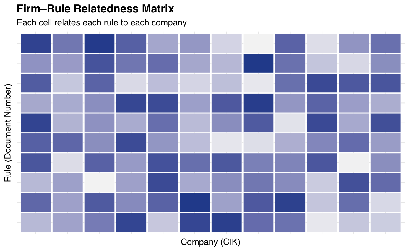 Company-specific measure of rule relatedness for all proposed and final rules between 1999 and 2023.